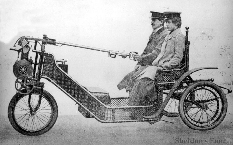 Their goods delivery motor-tricycle had a 4.5 h.p. air-cooled engine mounted above the front wheel, which it drove by chain. Steered using a long handle, it is not clear from the photograph how the goods compartment was afixed to the chassis.