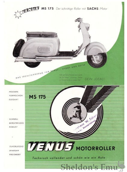 The Venus motor scooter was inspired by the Italian Vespa and came in three different versions using 100cc, 150cc and 175cc single cylinder 2-stroke Fichtel & Sachs engines. Each model had minor styling differences - the DS 100 had a solo seat and no spare wheel, whereas the MS175 had a dual seat and a spare tyre attached at the rear.
