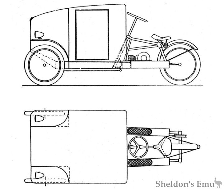 This was a three-wheeler which seated two and was driven by a single cylinder engine which drove the rear wheel. They also built a delivery tricycle with the goods container at the front. It had a single saddle and a steering wheel.