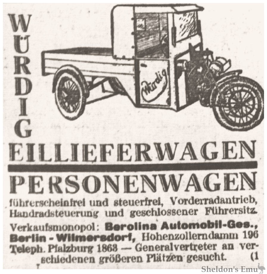 These were three-wheeled delivery vans (Eilwagen) with an engine mounted above the front wheel and a tray and two wheels at the rear. They employed both two-stroke and four-stroke engines.