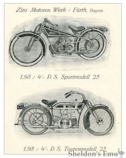 The Ziro motorcycle business continued under Rothammel as Ziro Motoren Werk from early 1924 until perhaps late 1925. During this period, two new models appeared, the "Sport Model 25" and the "Touring Model 25", both 346cc horizontal rotary-valve two-strokes.