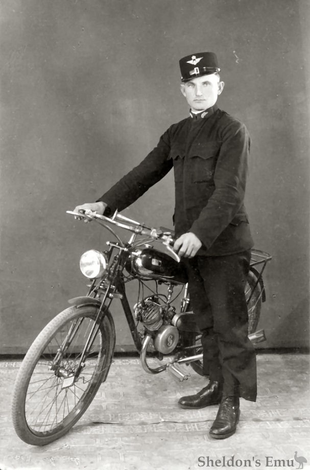 After 1918 he created the SH and SHB marques, and in the early 1930s the firm began production of utility three-wheelers and powered bicycles using Fichtel & amp; Sachs engines. In typical fashion the 74cc engine was placed within the bicycle frame's triangle, mounted beneath the crossbar near the steering head. Larger 98cc engines were fitted to the the commercial tricycles, and these soon became available for moped-style machines.