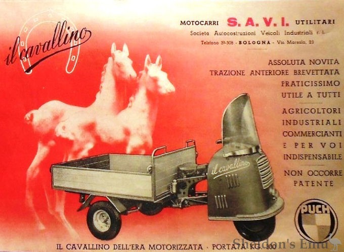 A small number of inexpensive three-wheelers were constructed in 1953 powered by Puch engines. These were marketed as "il cavallino".