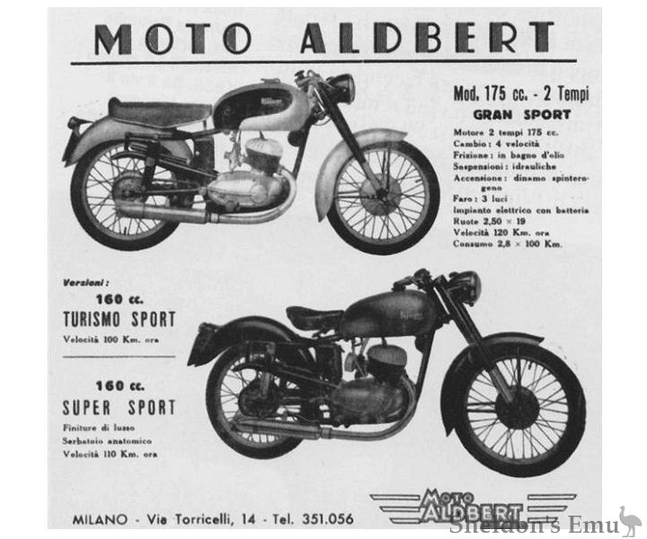 In 1951 Aldbert began producing a motorcycle with a 160cc two-stroke engine. The frames were built by Gino Tappella, a well known bicycle manufacturer who also built mopeds and light motorcycles sold under the brand name Schneller Fuchs.