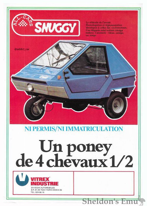 In France it was marketed by Vitrex as the Snuggy, and was fitted with a Motobecane 50cc engine. It was legal for anyone over 14 to drive it, sans permis.