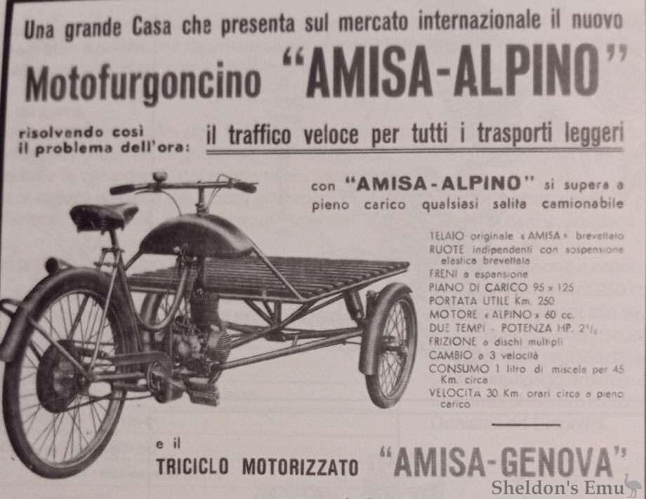 In 1946 Pietro Vassena designed a 125cc two-stroke twin with horizontal cylinders equipped with a rotary valve, mounted in an Amisa frame. This was presented at the 1948 Milan show as the Amisa-Rumi.