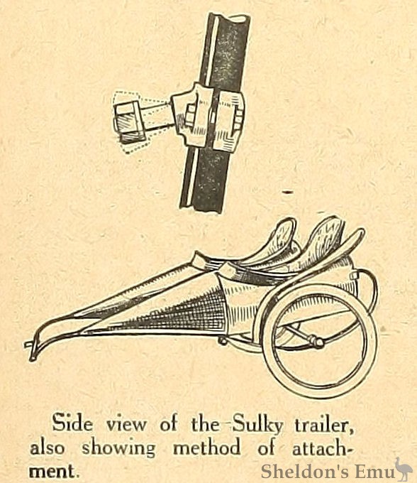 The inventor states that the combination can take corners without the slightest fear of upsetting either when fully loaded, one only occupied or both empty, and that every ounce of motor power is used for hauling the trailers, and practically no strain is imposed on the motor cycle frame.
