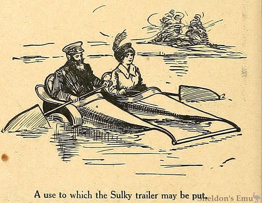 Another interesting feature of these trailers is that they can be used as a canoe if removed from the chassis, as they float admirably. The invention is known as the Sulky trailer, and weighs about 150 lb.