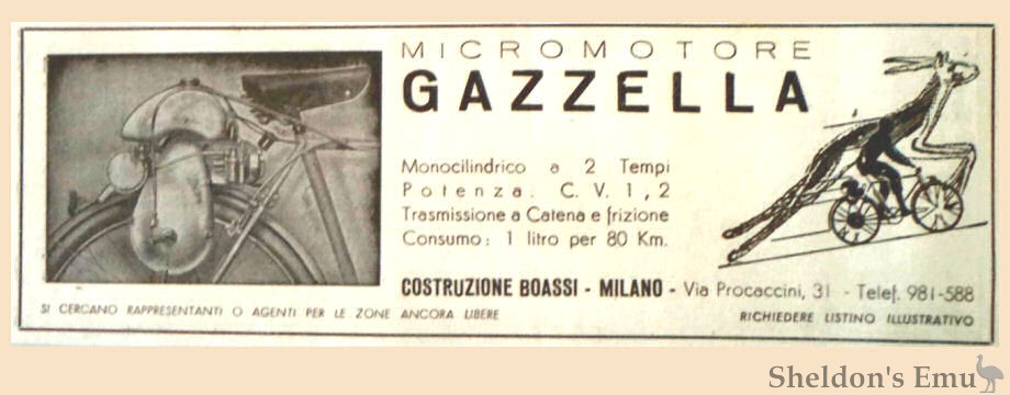 A Milan company which from 1946 or '47 to c.1954 built two-stroke Gazzella auxiliary engines of 60cc, and 65cc motorcycles with a two-speed gearbox.