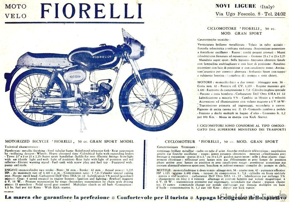 Established as a bicycle factory during the 1920s in Novi Ligure, between Milan and Genoa, the company built a 125cc two-stroke three-speed machine in 1951 and the following year added Sport and Gran Turismo versions which differed cosmetically to the Normale. 1953 saw a number of 175cc models added to the range. Most were powered by JLO engines