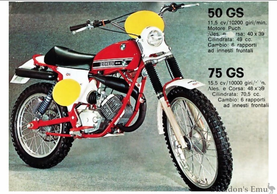 The Frigerio brothers of Treviglio built mopeds and off-road enduro motorcycles of 175 to 350cc based on Gilera four-strokes. Their father, Ercole Frigerio, was a well-known racer.