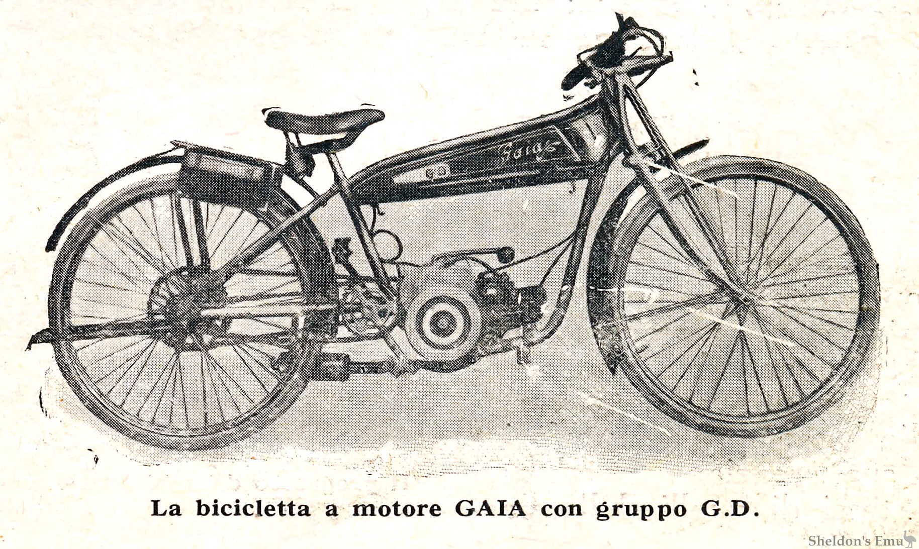 Established in 1905 as Secolari Stabilimenti Meccanici Bertot-Rocca in Forno Canavese, Turin in 1905 as a bicycle manufacturer, Giuseppe Gaia began building motorcycles in 1922, having moved to Turin city. The first model was equipped with the German Alba (1) engine, an inclined single cylinder side-valve 192cc with magneto ignition. It has girder forks, a separate two-speed gearbox, primary and secondary transmission by chain, and on the right there is the chain for the pedals.
