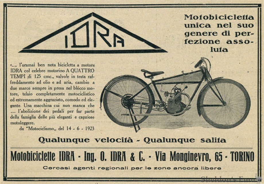 "...l'oramai ben nota bicicletta a motore IDRA col celebre motorino A QUATTRO TEMPI di 125 cmc., valvole in testa raffreddamento ad olio e ad aria, cambio a due marce sempre in presa nel blocco motore, telaio completamente motociclistico ed estremamente aggraziato, comodo ed elegante. Una macchina cui non manca che ... l'abolizione dei pedali per far parte dena famiglia delle pii eleganti e capziose motoleggere." da "Motociclismo" del 14-6-1923