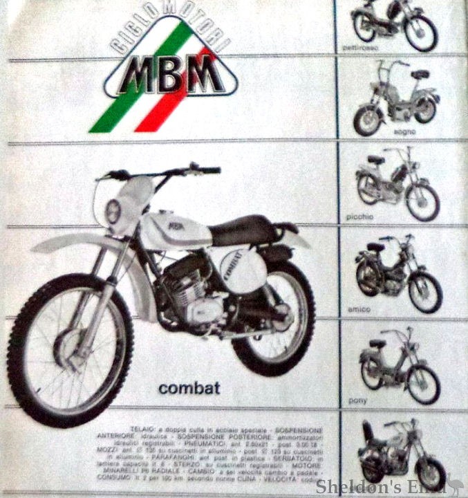 Other models include MBM Amico 50 (1976-77), built in the "turbone" fashion, the similar Pony of 1972 with a 49cc Minarelli V1 engine, the Chico Bimbo minibike (S5K engine, 8 & 9in wheels), and 50cc offroad machines named Combat.