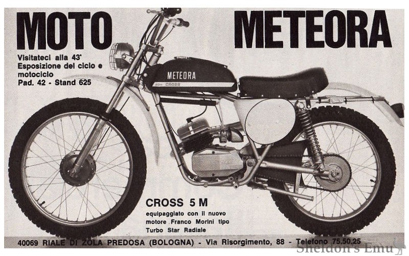 In 1975 Meteora formed an agreement with Motobécane to built lightweights for the export markets, and after 1980 [2] they ceased producing machines under the Meteora brand and supplied other companies including Malaguti, Malanca, SWM and Moto Villa. After 2000 they worked with Honda assembling Japanese machines for the Italian market, and also assembled LEM motos and the Beta Minimoto.
