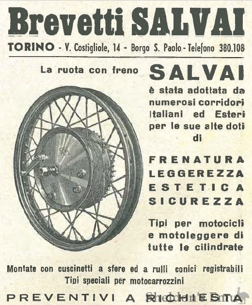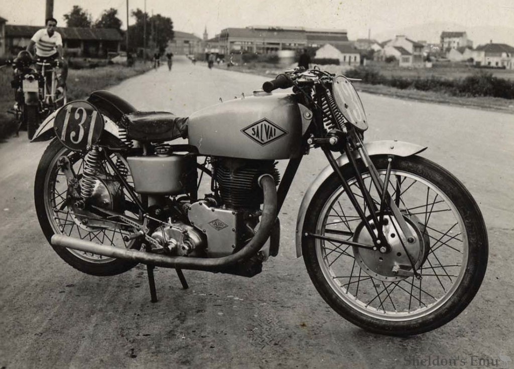 Giuseppe Salvai of Torino, owner of a workshop specializing in high quality drum brakes which were later adopted by major manufacturers such as Aermacchi and Rumi, began in 1946 developing a 500cc engine and built several prototype motorcycles.
