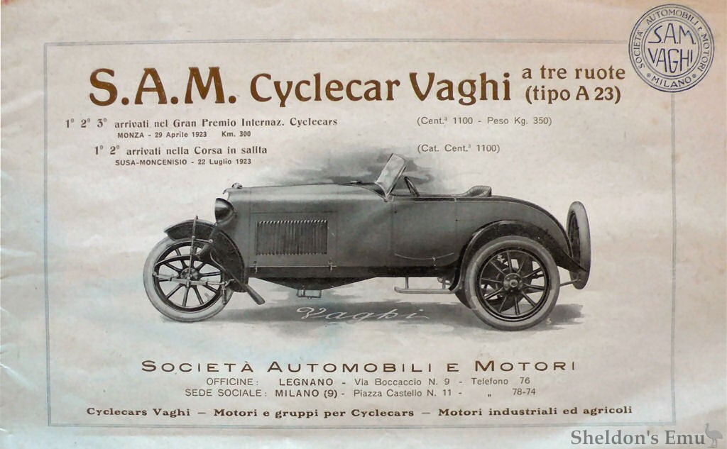 Their first model was a three-wheeler named the S.A.M. Vaghi, powered by an 1100cc engine. Also available as a four-wheeler, the marque entered the field with great aplomb, taking the first three places of the 1923 Milan Cyclecar GP. 1