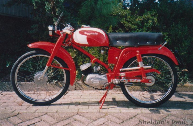 In the 50s they offered the 48cc T48 Competitzione, a moped of quite sporty appearance with a nacelle fairing, hydraulic suspension front and rear, 3 speed gearbox, 18" wheels and a double cradle frame.