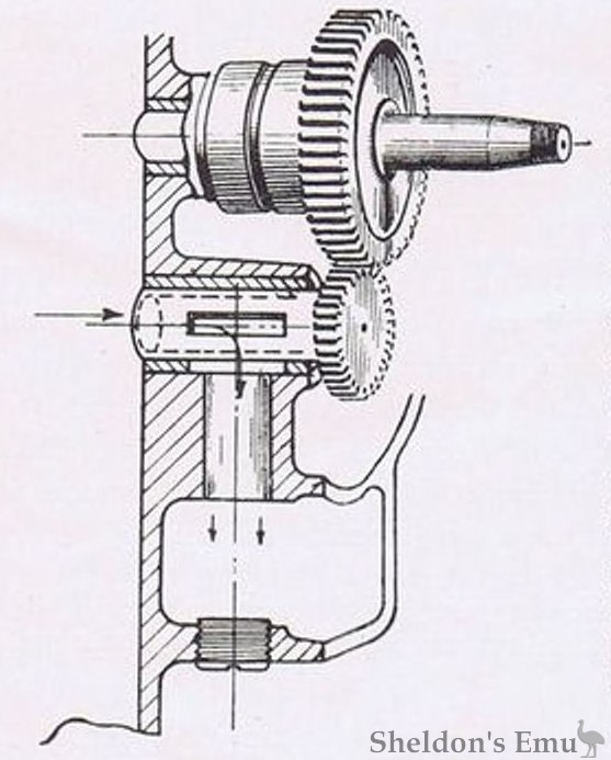 A vertical passage between the timing case and oil box is closed at its upper end by a horizontal sleeve, which is rotated at engine speed by the cam wheel, and is blanked oft at the driven end. The inner end of this sleeve communicates with the crankcase, and when a slot in the sleeve comes into line with the vertical passage, oil is forced through into the oil box by the descending piston. The rotary valve is timed so that the slot has just passed the oil box opening when the front piston is at bottom dead centre: or, in the case of singles, when the piston is 25° past bottom dead centre.