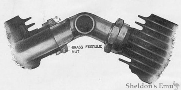 In the case of twin cylindered engines a special design of induction pipe union is employed. The inlet pipe is of the same diameter throughout, and the brass ferrule A, is a sliding fit on this.