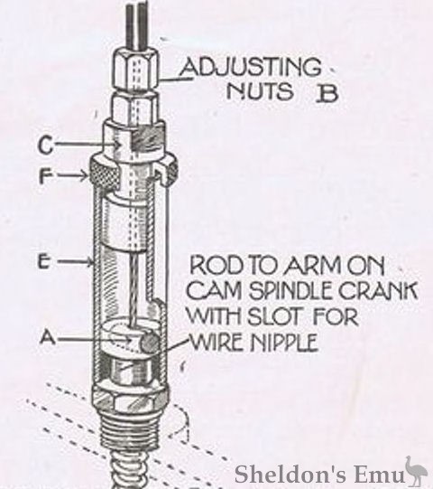 The EXHAUST VALVE LIFTER is screwed into the timing case cover, and its method of working can easily be understood from a glance at the sketch at the side. When the cable has to be detached, the Bowden adjuster must be pulled up until the knurled collar can be removed; the spacing sleeve is then slid up the wire until the nipple can be removed from the brass yoke piece.