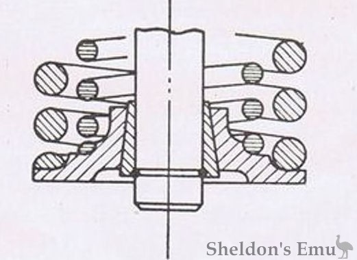 On many S.V. and all O.H.V, engines the valve stem is not drilled for a cotter, but is recessed near the end to locate a spring circlip. A split taper collar lodged here bears the pressure of the valve spring collar which is tapered inside to correspond.