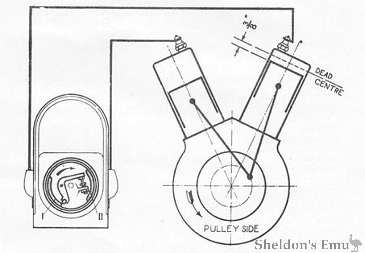In setting the magneto timing the following method should be adopted. The engine should be turned forward until the piston - in the case of twins, the REAR piston - is 7⁄16 in. or so before the top dead centre of the compression stroke. (The correct timing is given overleaf.) The contact-breaker on the magneto should then be placed in the fully advanced position, and the armature rotated until the platinum points are just being separated by the cam.