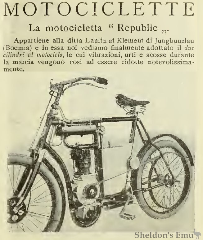 La motocicletta Republic Appartiene alla ditta Laurin et Klement di Jungbunzlau (Boemia) e in essa noi vcdiamo finalmente adottato il duc ciliudri al motociclo, le cui vibrazioni, urti e scosse durante la marcia vengono cosi ad essere ridotte notevolissimamente.