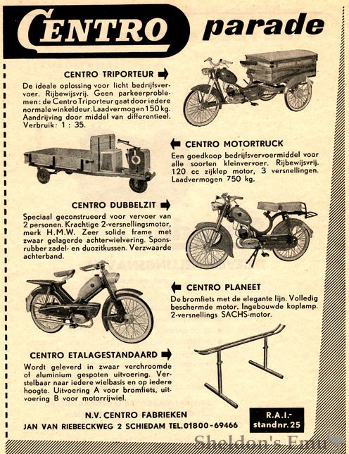 The firm also built commercial three-wheelers including the Centro Triporteur which was a moped with two wheels and a carrier at the the rear, and the Centro Motortruck designed for factory use, with the engine mounted above the single front wheel.