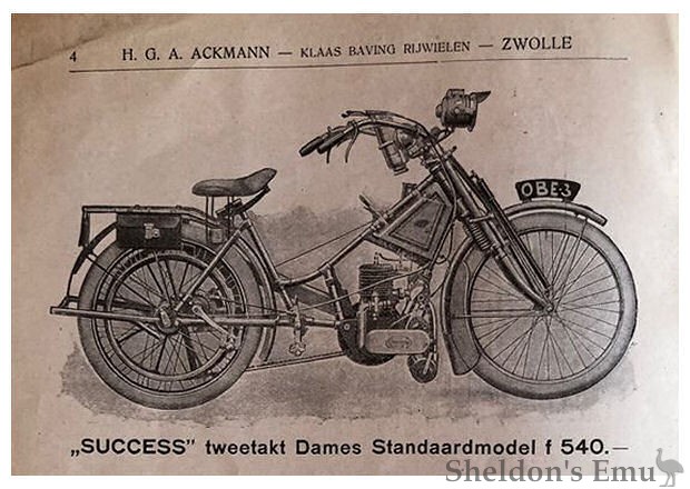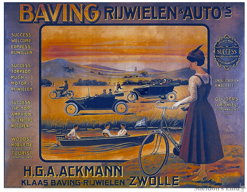 Built in Zwolle by Klaas Baving from 1904, the first models had a Fafnir engine. The firm was acquired by H.G. A. Ackmann in 1912 but continued to advertise the Klaas Baving name as it had become very well known due to extensive advertising and high quality catalogues. The Success brand of motorcycle was still offered in 1914 and 1916. The firm was purchased by J. Kappers in 1937 and remained active until 1967.