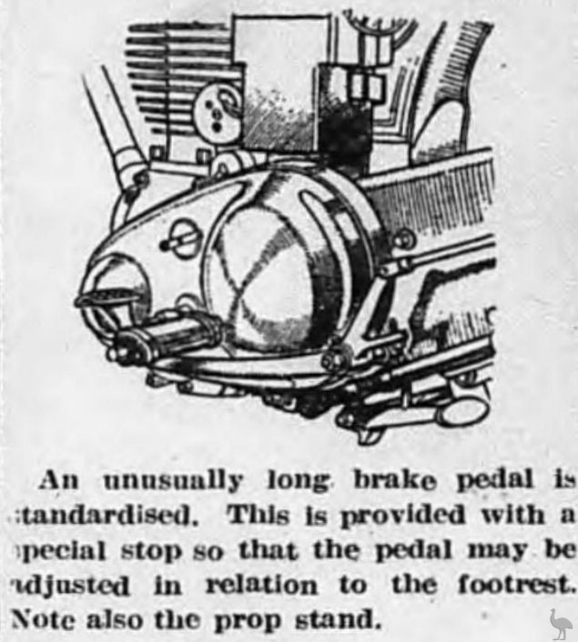 An unusually long brake pedal is standardised. This is provided with a special stop so that the pedal may be adjusted in relation to the footrest. Note also the prop stand.