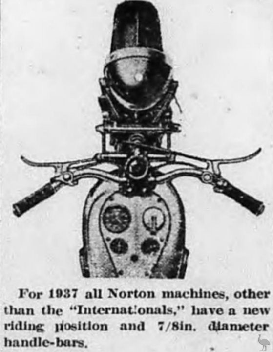 For 1937 all Norton machines, other than the "Internationals," have a new riding position and 7/8in. diameter handle-bars.