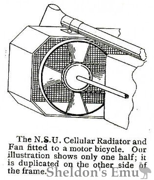 The N.S.U. Cellular Radiator and Fan fitted to a motor bicycle. Our illustration shows only one half; it is duplicated on the other side of the frame.