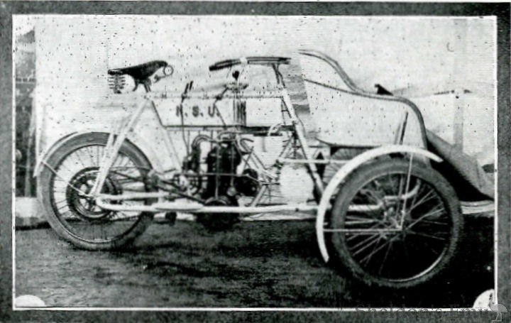 Sidecars are an introduction this year, these being made adjustable so that they will suit any bicycle bought from the firm. The design differs a little from English sidecars. The frame is composed of very large tubing, these tubes being provided with clamps, which enable the sidecars be moved so that the rider on the machine and the occupant of the sidecar can be brought exactly in line on any machine that is made by the company. We understand that numbers of these machines are being exported, and that the trade in motor cycles at the Neckarsulm factory is quite as good at this time of the year as it is in the summer, owing to the way the colonial trade has been developed, and that this is extending in all directions.