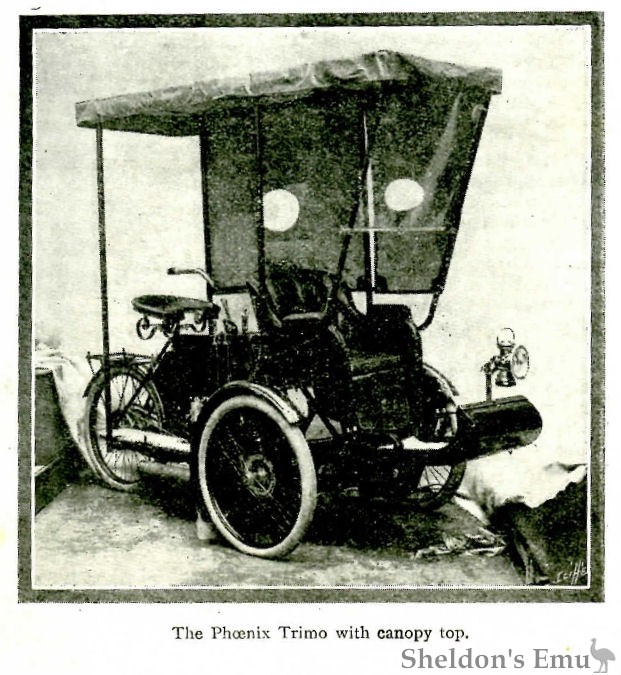 Phoenix Motors, Ltd., Caledonian Road, N. (Stand 147), are showing an attractive exhibit in the shape of a Trimo fitted with a canopy having a celluloid screen in front, which, when not required, will fold out of the way entirely. Side screens are also provided, into which celluloid panels are inserted, and these may be rolled up into small compass when not in use. For the driver a comfortable seat is fitted, this being slung on C springs. The footboards are mounted on hinges, so that any part of the motor is easily accessible. The ignition is the Simms-Bosch high-tension magneto, and is driven off the motor by chain. The silencer has a cut out, which can be put in action by the driver's feet. If necessary it can be retained by a catch, and released at a moment's notice by a touch of the foot. There is a powerful band brake fitted to the back wheel, worked by the driver's right foot. The front brakes command special attention, as they are of ample size and worked by a stout Bowden cable.