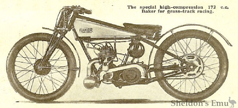 BAKER machines for next year will be available in five forms for road use, and in addition there will be a special model built primarily for grass-track racing. From the point of view of appearance alone, the new models represent a distinct advance on the 1928 productions. The " Colonial " frame, with its high ground clearance, is standardized now for all models, and saddle tanks, shapely in outline and neatly finished with a yellow panel on a black ground, are employed on ail hut one design.