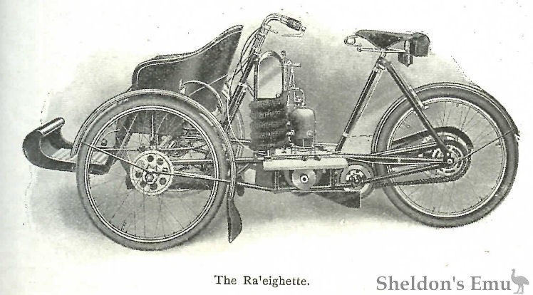 The Raleigh Cycle Co., Ltd., of Nottingham, will exhibit on their stand at the National Show a 3 h.p. chain-driven motor cycle, embodying all the most improved and up-to-date ideas as applied to motor bicycles. All taps and levers are dispensed with-on this machine, it being controlled from the handlebar by means of twisting handles and Bowden wire. The engine is fitted with a governor, which allows the machine to be driven from a mere crawl up to thirty-five miles an hour. The drive is by a Hans Renold motor chain from a spring clutch on the engine pulley to a countershaft, and thence to a spring chain wheel on the driving wheel. One of the novelties on this stand will be the new Raleighette, or three-wheeled motor tandem. This is an entirely new departure in forecarriages. The power is derived from a 3¼ h.p. water-cooled engine, with chain transmission and a two-speed gear, which enables the machine with two passengers to climb any hill without overheating the engine. A 2 h.p. chain-driven motor cycle and a 2 h.p. belt-driven machine, both of these selling at a very moderate price, complete the exhibit. A duplicate set of these motors will be running in the Palace grounds, where intending purchasers may enjoy a trial run.