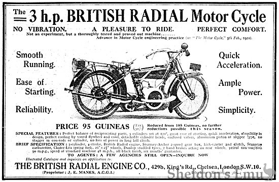 The British Radial Engine Company of Lacland Place, London, SW10 produced motorcycles from 1921 to 1922.
