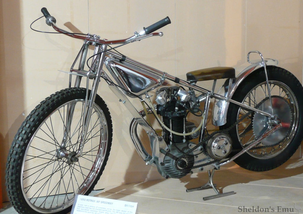 The Rotrax frames were chromed by a firm in Gosport and then sent on to Alec Jackson's in London for the fitting of a JAP engine. These machines became known as the Jackson-Rotrax.