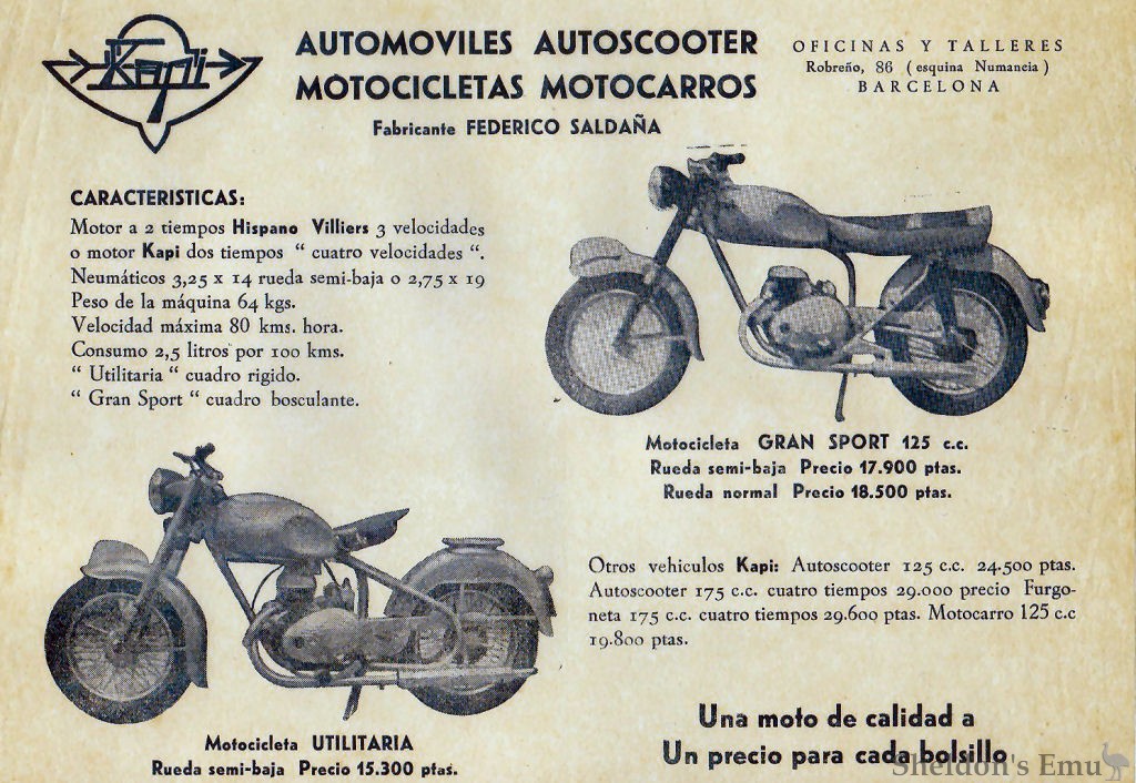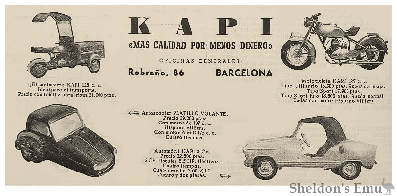 The Kapiscooter was introduced in 1951, a three-wheeler using 125cc Hispano Villiers and 175cc Fita AMC four-stroke engines.