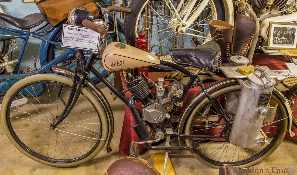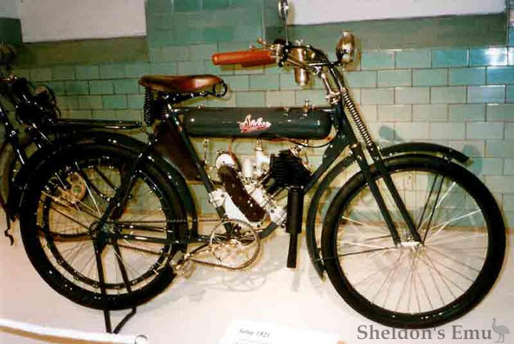 These were lightweights using an inclined engine, with an optional clutch introduced in 1912. The 1912 version had a large cylindrical brass tank, belt drive and pedals, rim brake acting on the belt sprocket, and rudimentary front suspension. Four examples remain, at least one of which has beautifully restored.