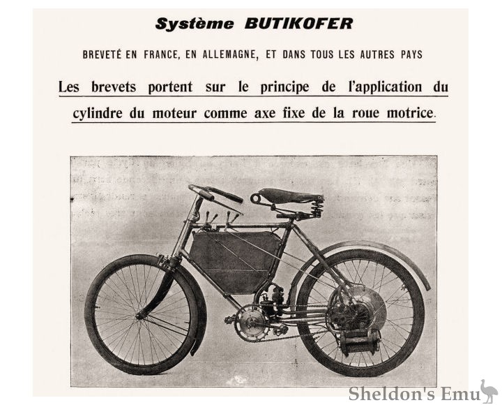 Edouard Butikofer of Switzerland displayed a "motocycle" (motor bicycle) on the Peugeot stand at the Paris Salon of 1898. The Butikofer is discussed in "The Horseless Age" of April 1896, and in a short article in The Automobile Magazine of December 1899