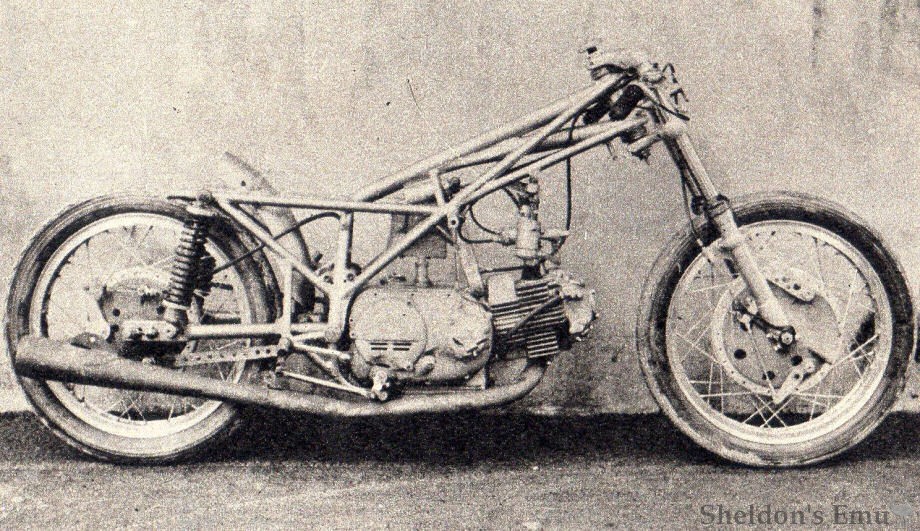 Paolo Campanelli, the well-known senior from Pesaro who has been living in Switzerland for a long time while continuing to race successfully in Italy, has built this trellis frame for the Aermacchi and Motobi 250 engines. It is the same as the one Campanelli himself has tested extensively with excellent results in races in recent times and can be supplied at a "friend" price to owners of Motobi and Aermacchi who request it directly from Paolo Campanelli, Klingenstrasse 38, Zurich.