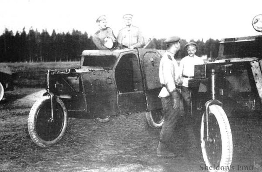 A three-wheeled armoured car, some 20 were made for the Russian War Ministry in 1916 as a private initiative.