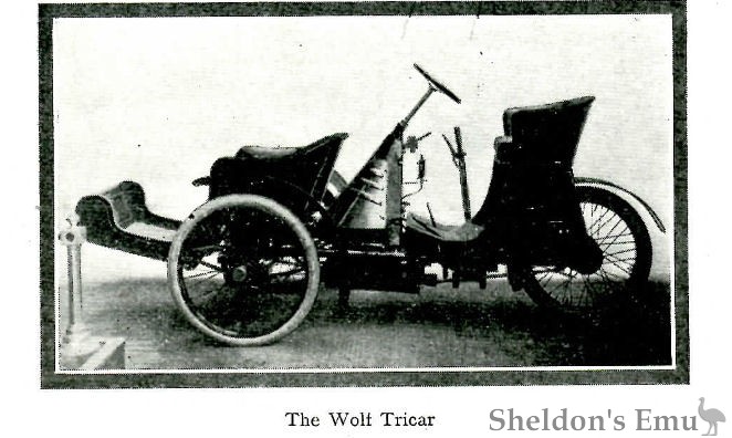 Wheel steering is employed, and the control levers are very conveniently arranged. Foot levers operate the clutch and brakes. The front seat is well sprung, and beneath this is placed the water tank, radiator, and the circulating pump, which is driven by an extension from the engine, which is, of course, placed longitudinally in the frame. The back driving seat is coach-built, and the body work is carried down to the frame, the working space thus obtained being taken advantage of for the provision of cupboards for accumulators, coils, and other parts. The standard type Wolf motor cycles made by this firm are also exhibited, and are well worthy of attention.