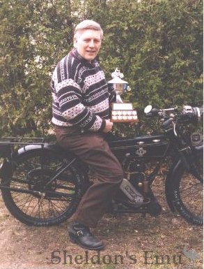 Allan Johnson of the Canadian Vintage Mototcycle Group, on his 1927 Levis Model M 250 2-stroke. The trophy is the Cycle Canada Trophy for the best performance on a 1945 or earlier motorcycle at the 1997 CVMG Annual Rally.