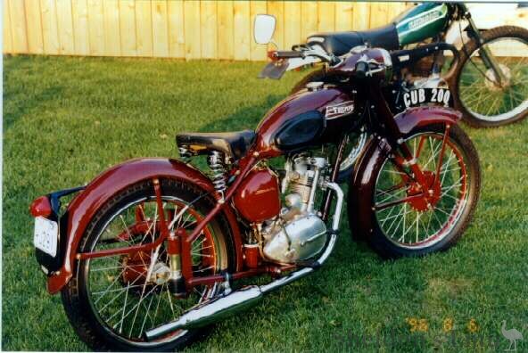 From Gord Jones of the Canadian Vintage Motorcycle Group comes this 1954 Tiger Cub. He knows it should be blue, but exercised "restorer's choice" and picked Amaranth Red.