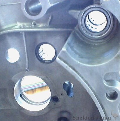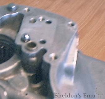 A hole is drilled from above the bearing inside the crankcase, to meet the bearing oil groove. A groove in the sidewall of the case forms a channel for the oil to run. I also drilled a hole in the top web and scalloped the area to act as a catchment for oil, much like the one for the idler gear. The area of the case that prevented the bush from turning must be machined flat all the way to the curved part of the crankcase.