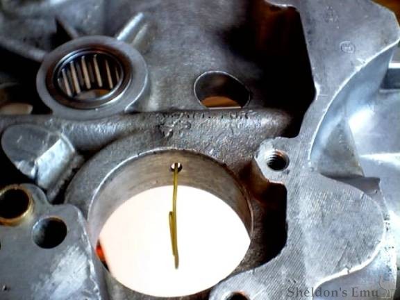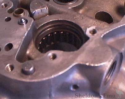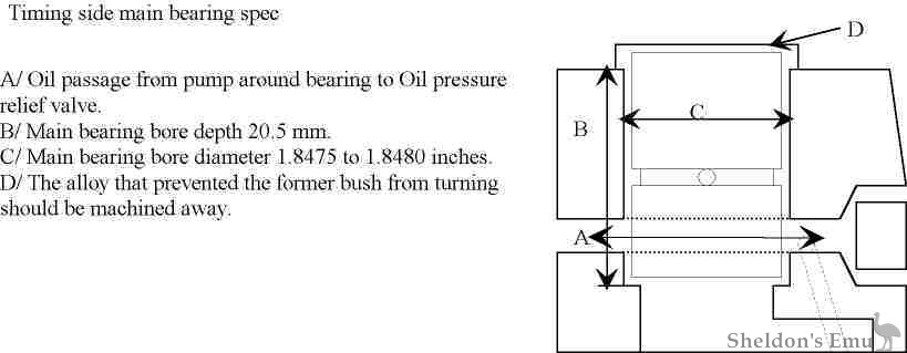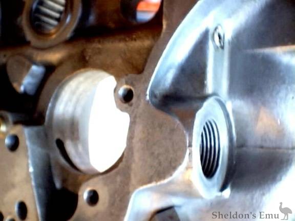 The depth of the hole is 20.5 mm measured from the machined area that the original bush sat against. The bearing rests against the step left in the hole. It is important that the bearing when fitted covers the 2 holes, 1 from the oil pump and the other to the oil pressure relief valve. A groove 4 mm square is machined around the bearing to join these two holes. If this groove coincides with the BEARING oil groove, oil pressure to the big ends will be LOST!!!