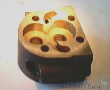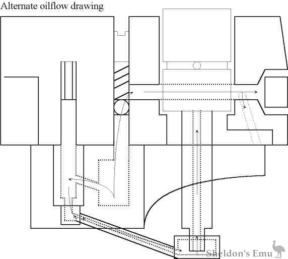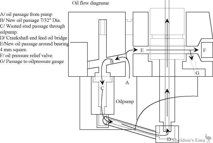This is the way the oil flows in this type of conversion. From the oil pump it splits in 2,part goes through the new oil gallery up the wasted oil pump-fixing bolt to a bridge that takes it to the crankshaft quill and on to the big ends. The rest goes around the new 4 mm square-bearing groove to the pressure relief valve and some is bled off to a 100 psi glycol filled oil pressure gauge.
